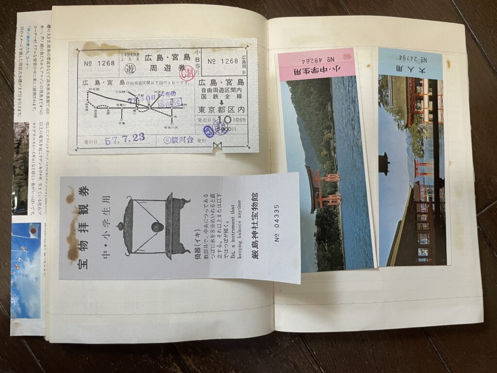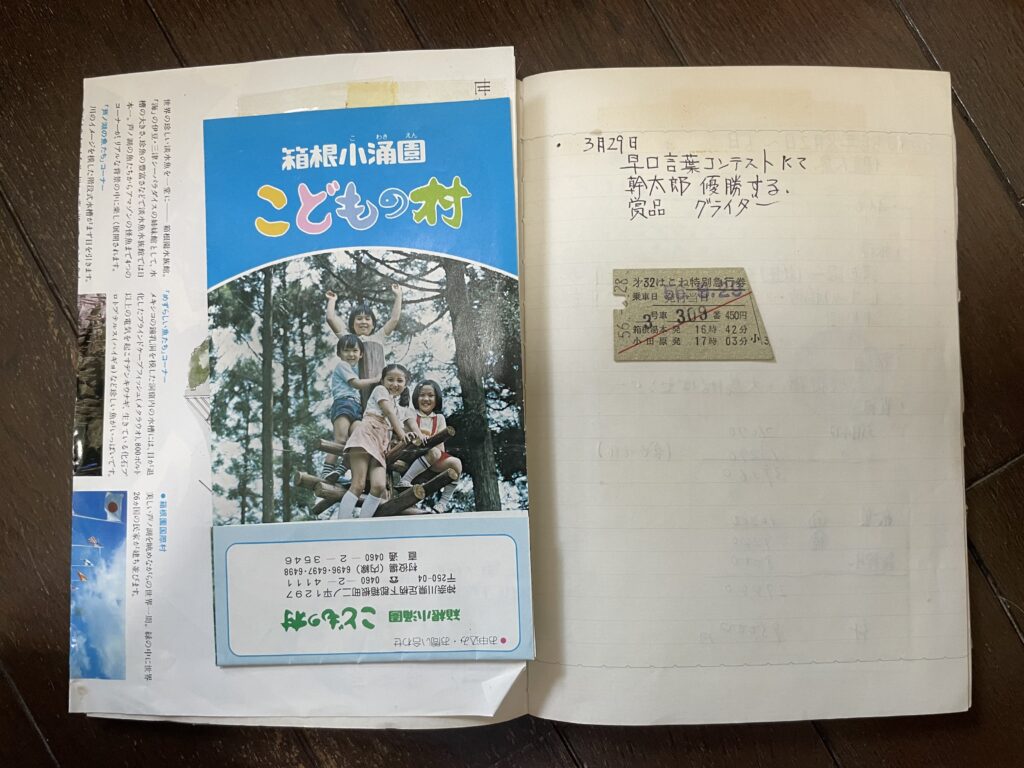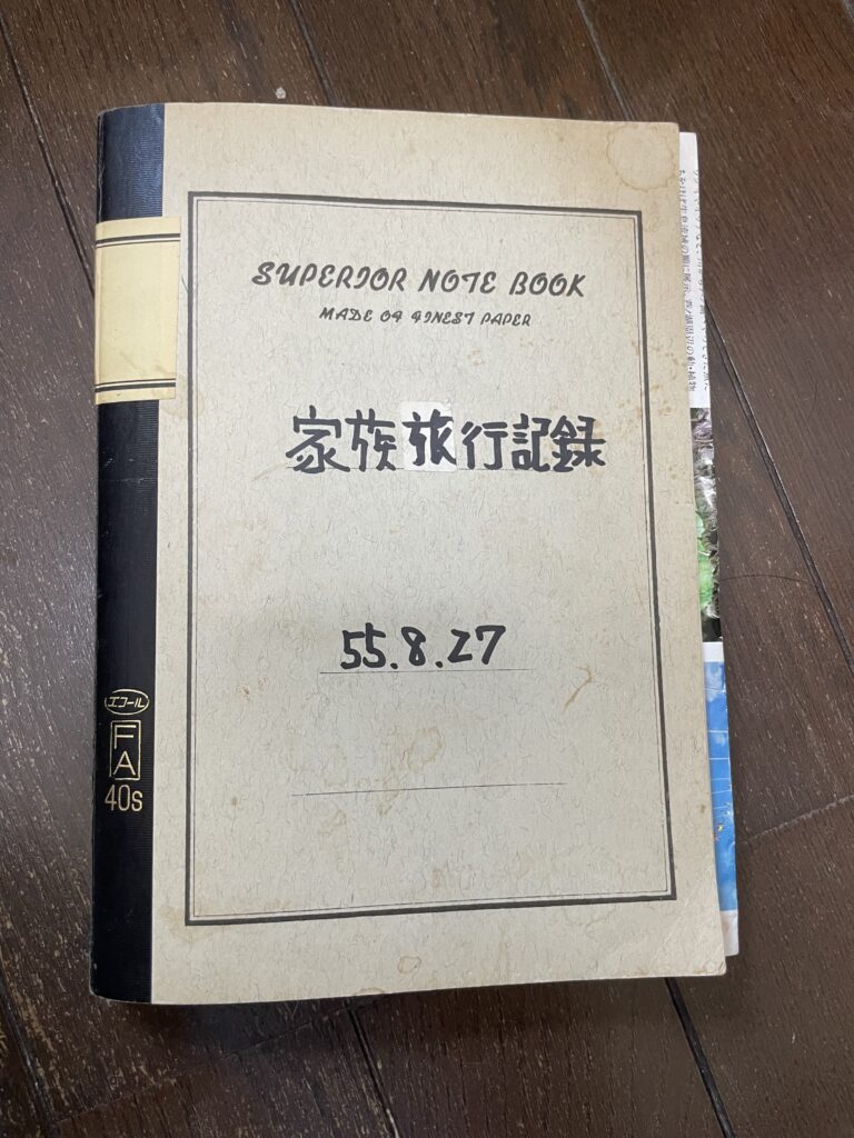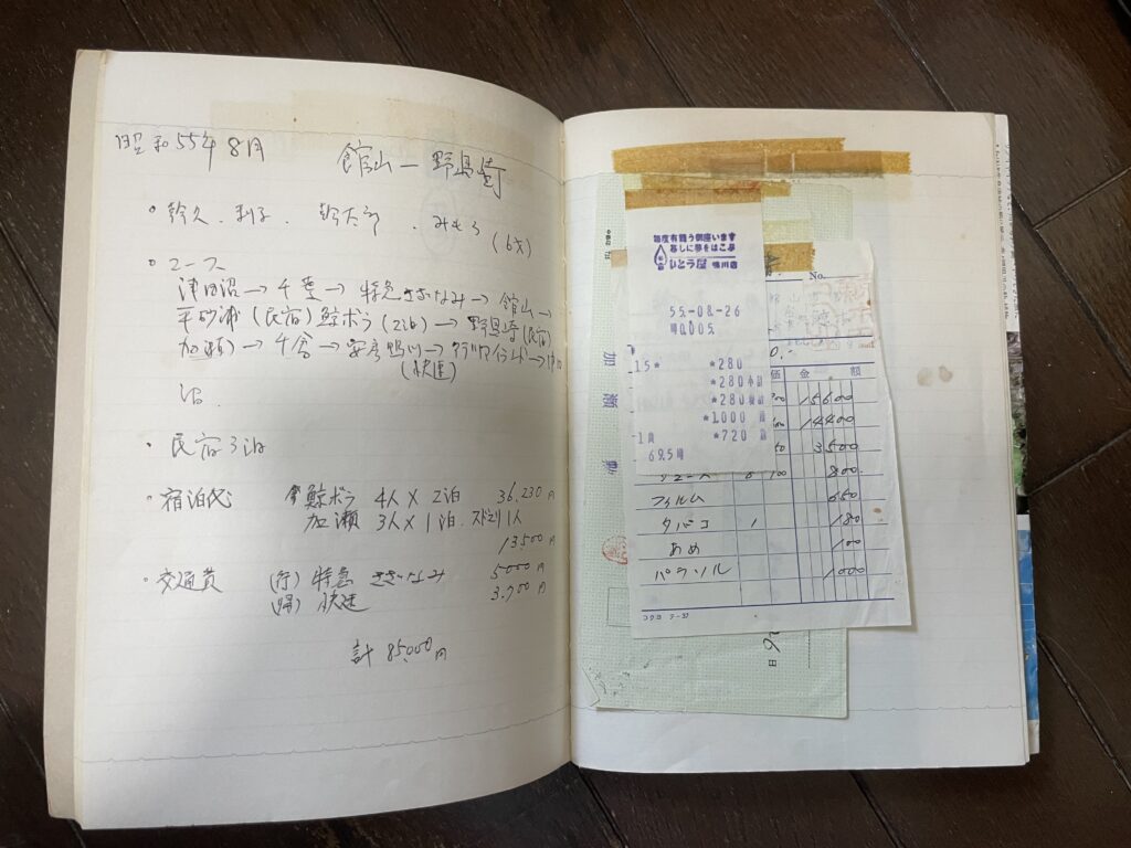収蔵日記紹介010の男性が書いた家族旅行記。1980年代の家族での国内旅行行程や出費一覧、寺社仏閣の入場券がスクラップされている。
